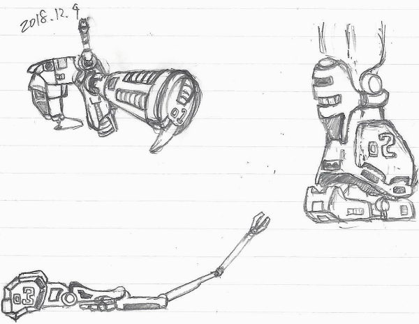 と考えてマジックハンド・・・後のフォールディングアーム(苦労して頭を捻ったのでお気に入り)ハンドは簡単な恰好にして頑丈に、通常時は肘のアーマー&固定ラッチとして機能
