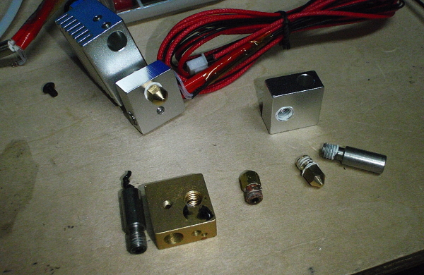 新型機導入(タランチュラ)#12 前回のトラブル原因を突き止めました。 案の定、ノズルの詰まりでした。 エクストルーダーを分解すると・・・フィラメントが中で固着していた。 真鍮部分迄はみ出している・・・!? ヒーターを固定するイモネジ穴がなめて居て、6角ドライバーが空回りしてしまう・・・ 「作りの悪さは某中製の特徴?」ニッパーで挟み回して外した。 ノズルとガイド?(銀色のパイプ)はシリコン系接着剤?で緩み止めされているが ラジオペンチなどで挟んで捩じれば、簡単に外れる(傷をつけない様に、力を入れず滑らせず) 後は詰まったフィラメントを、台所のガスコンロで炙れば中身は溶けだす。 PRN3Dで経験済み。 仕組みを調べる為、次期装備用デュアルエクストルーダー(別購入)のヒートエンド部分も分解してみた。 やはりイモネジが良くないだけでなくネジ山が舐めてしまった。 仕方ない、熱伝導性接着剤を購入し、組直す迄お預け。 尚、熱伝導性接着剤はCOM-G52を試してみるつもり。 この機種は260度まで耐えられると言う(ただしフルメタルのヒートノズルにしないと駄目)現在の仕様ではMAX240度。調べたらRepRap系はこれがフルメタルホットエンドでした(追記) http://hobhob3dmode.blog.shinobi.jp/3dprint/%E6%96%B0%E5%9E%8B%E6%A9%9F%E5%B0%8E%E5%85%A5%EF%BC%88%E3%82%BF%E3%83%A9%E3%83%B3%E3%83%81%E3%83%A5%E3%83%A9%EF%BC%89-12新型機導入(タランチュラ)#12